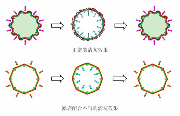 我們知道,脈沖清灰實(shí)際上是利用脈沖氣流與二次氣流對(duì)濾袋的沖擊,使濾袋由上向下在緯向出現(xiàn)形變,形變的慣性和濾袋與籠骨的碰撞在表面粉塵層造成“雪崩效應(yīng)”,從而清除表面灰塵。清灰效果很大程度上取決于形變慣性的大小和濾袋與籠骨碰撞的強(qiáng)度。實(shí)際應(yīng)用中,由于濾袋緯向尺寸過(guò)小或使用中濾料熱收縮程度太大等原因,經(jīng)過(guò)一段時(shí)間使用,濾袋“捆綁”在籠骨上無(wú)法分離。此時(shí),脈沖清灰造成的濾袋形變很小,濾袋與籠骨碰撞烈度有限,表面粉塵無(wú)法有效清除。 粉塵在濾袋表面長(zhǎng)期積累與板結(jié)就可能造成糊袋。